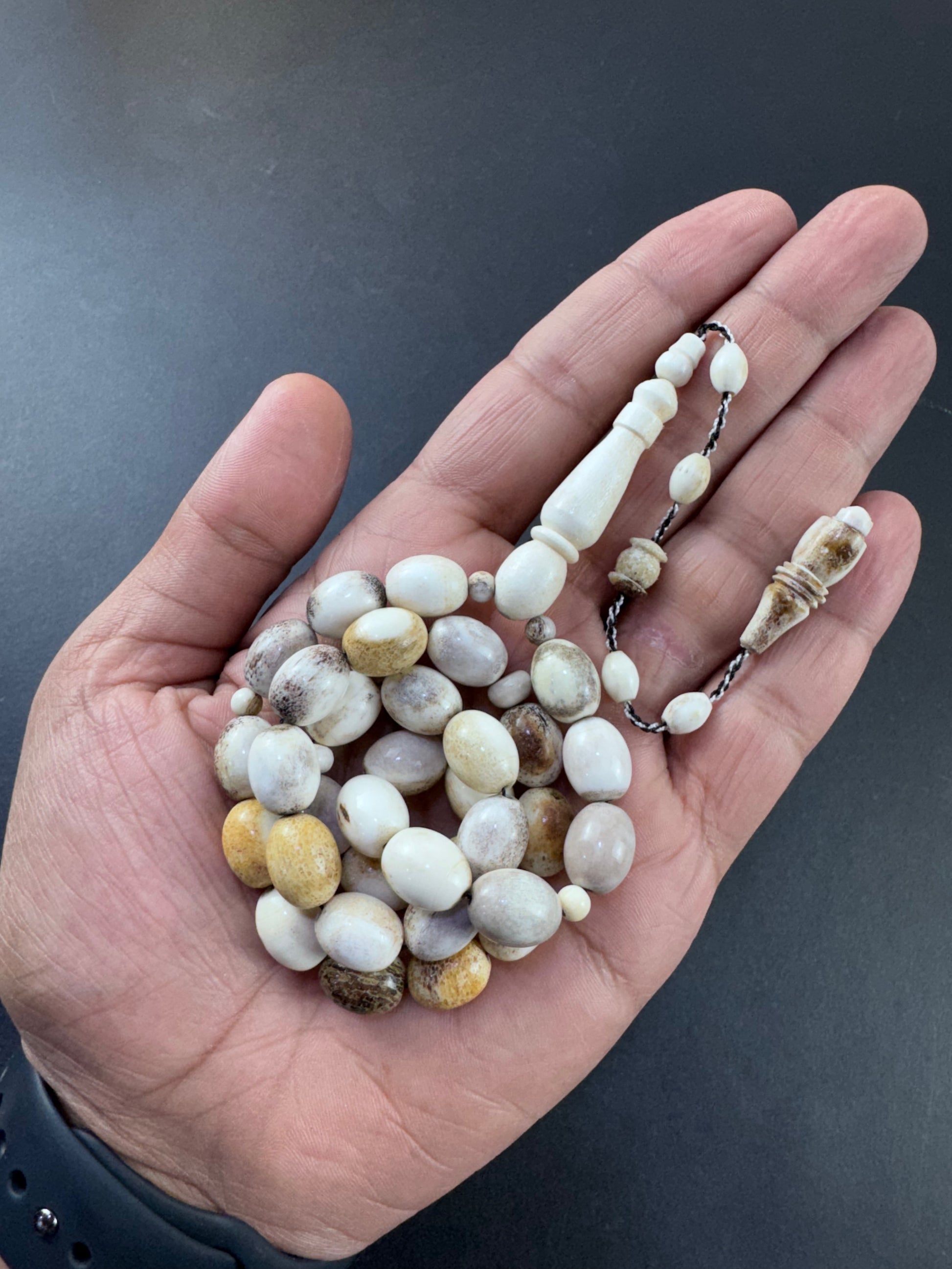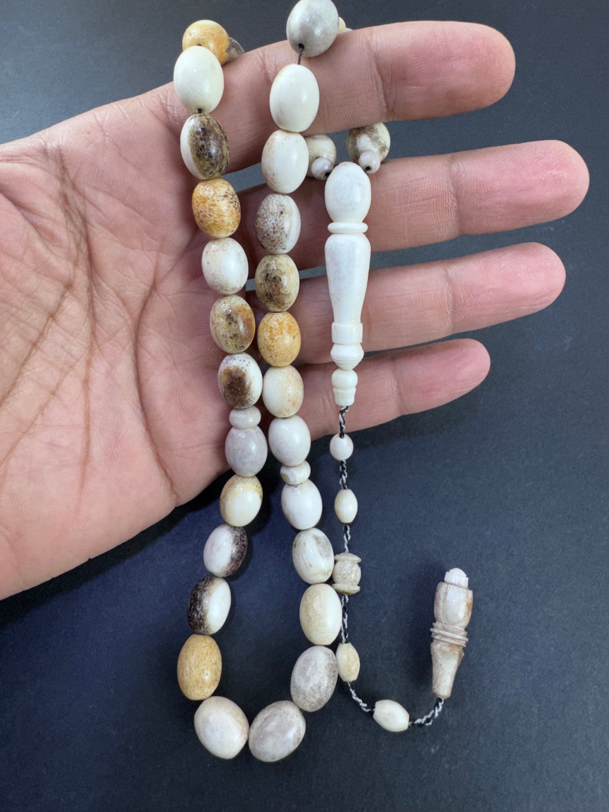 لهواة الخامات الطبيعية النادرة مسباح منحوت من قرن الغزال الاوروبي (الأيل) مزين بشاهد منقوش يدويا بحرفية عالية بعدد 33 خرزة ووزن 33 غرام مقاس 10*13 ملي طول 27 سم مزين بطقم تمليكة فاخر
