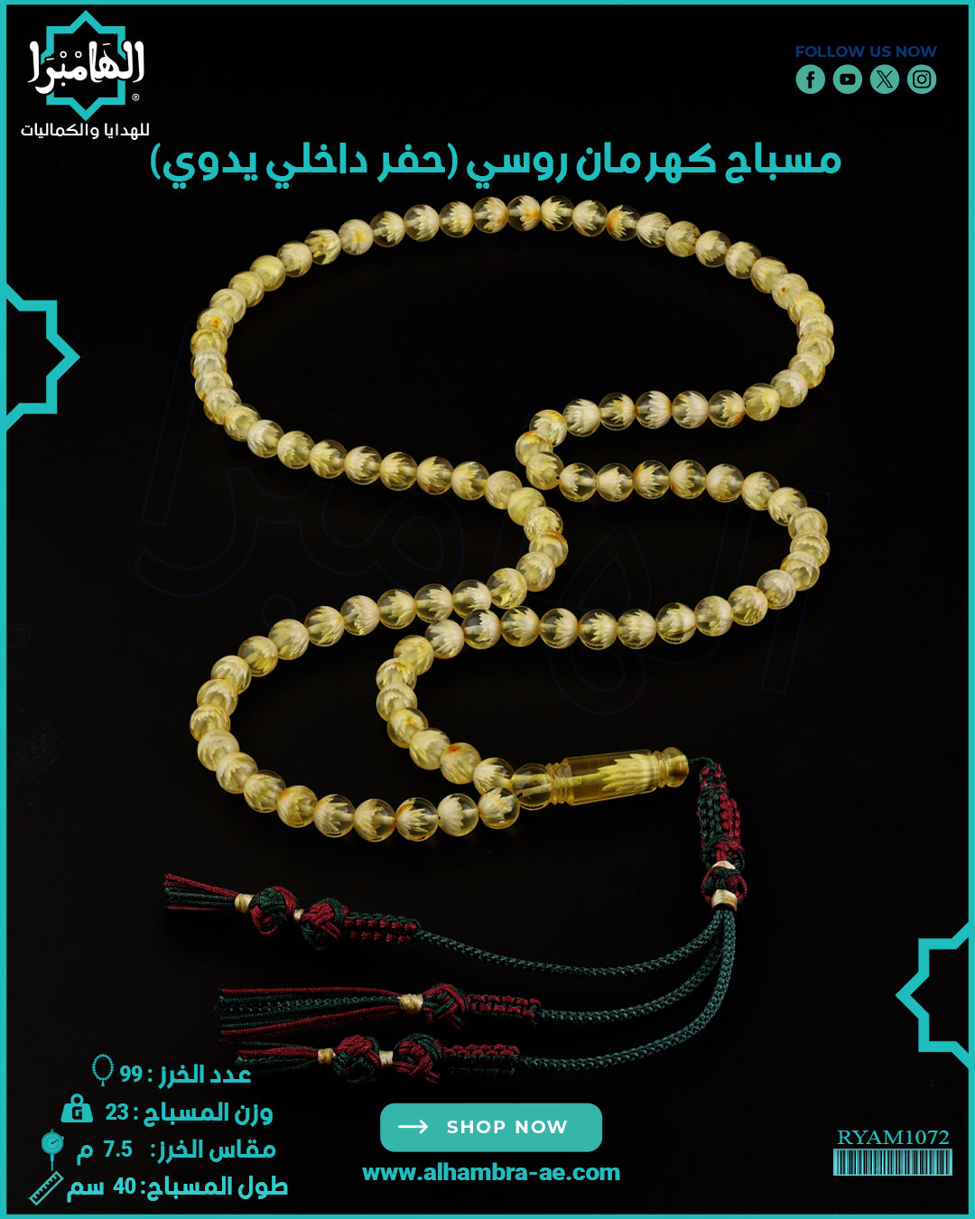 مسباح ملكي من (الكهرمان الروسي) بعدد 99 خرزة ووزن23 غرام مقاس7.5ملي طول 40سم مزين بكركوش من تفصالنا الخاص
